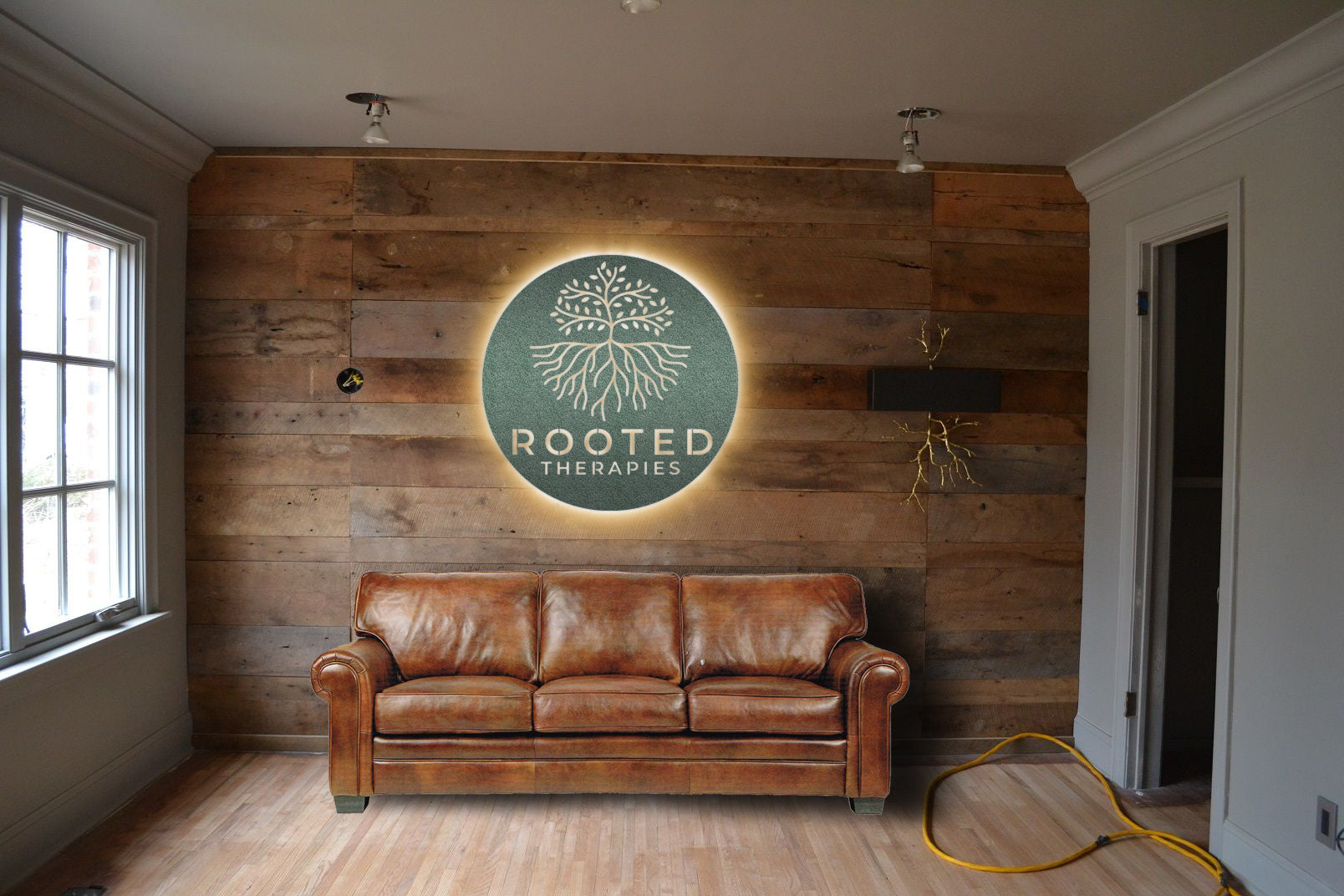 This listing is for (1) Rooted Therapy Sign with 1.5 inch standoffs (or LED Back lit option) to be mounted on wall.